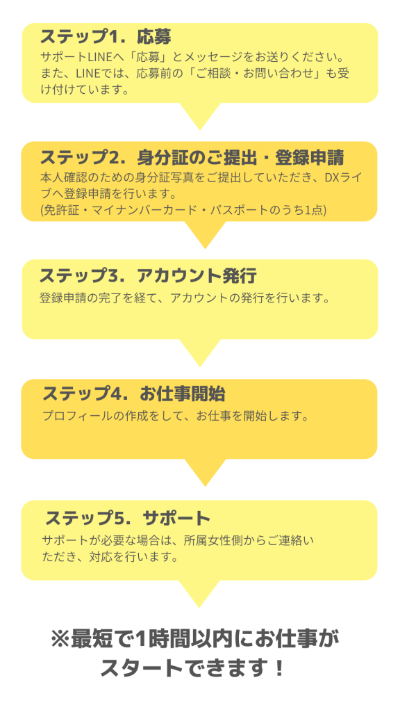 といったみなさんが、短時間で効率よくまとまったお金を稼ぐチャットレディのスタイルを目指していただく、DXライブ専門の在宅チャットレディ代理店です。