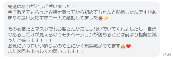 キャラ設定を試行錯誤したり、企画配信をメインにチャットをすることでお客様にも喜んでいただき、十分に納得ができる金額稼ぐことができました。