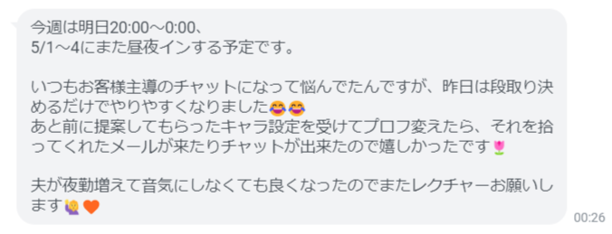 わたしも専業から兼業に移行するタイミングで、サポートをしてきたチャットレディさんと同じように「時間の確保」に悩んでいたので、「こんなやり方があるんだ!」と驚いたことを今でも覚えています。